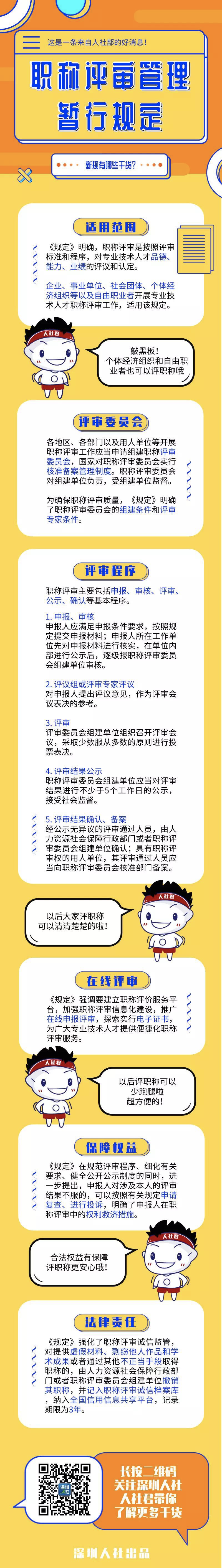 深圳特區(qū)報2019年7月12日訊 個體經(jīng)濟組織、自由職業(yè)者可以開展專業(yè)技術(shù)人才職稱評審;推廣在線評審,探索實行職稱評審電子證書;不正當手段取得職稱的,記入職稱評審誠信檔案庫……7月11日,記者從深圳市人力資源和社會保障局獲悉,《職稱評審管理暫行規(guī)定》(以下簡稱《規(guī)定》)將于9月1日起施行,這是國家深化職稱制度改革、加強職稱評審管理、完善職稱政策法規(guī)體系的一項重要舉措。