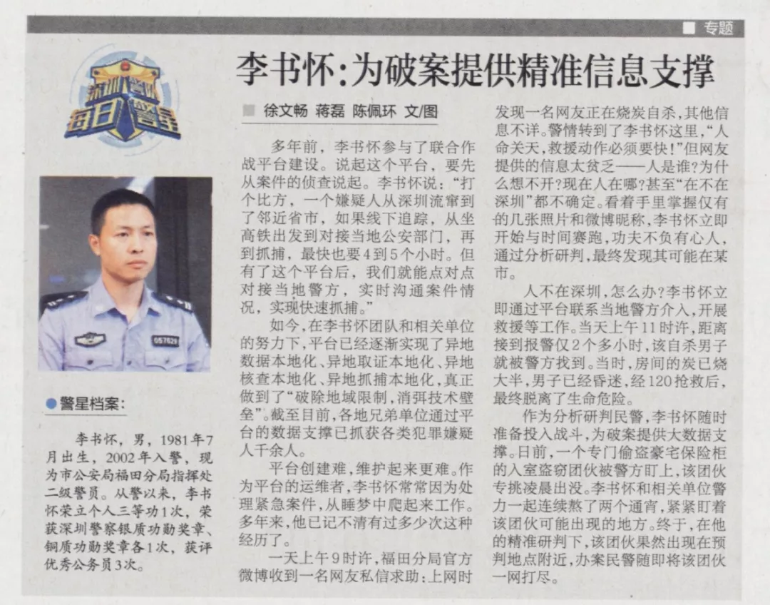 多年前,李書懷參與了聯(lián)合作戰(zhàn)平臺建設(shè)。說起這個平臺,要先從案件的偵查說起。李書懷說:“打個比方,一個嫌疑人從深圳流竄到了鄰近省市,如果線下追蹤,從坐高鐵出發(fā)到對接當?shù)毓膊块T,再到抓捕,最快也要4到5個小時。但有了這個平臺后,我們就能點對點對接當?shù)鼐?,實時溝通案件情況,實現(xiàn)快速抓捕?!?/p>