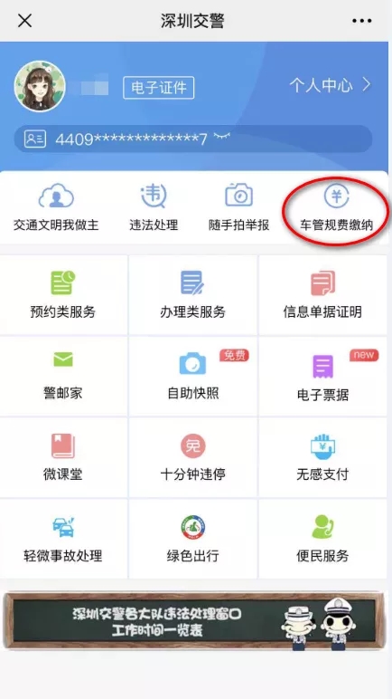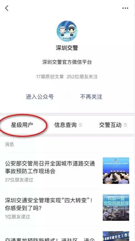 01 車主本人/代辦人關(guān)注【深圳交警】微信公眾號(hào),點(diǎn)擊進(jìn)入【星級(jí)用戶】,注冊(cè)登錄星級(jí)用戶后,在頁(yè)面選擇【車管規(guī)費(fèi)繳納】。