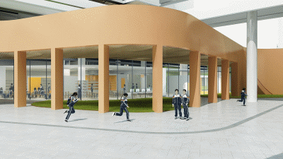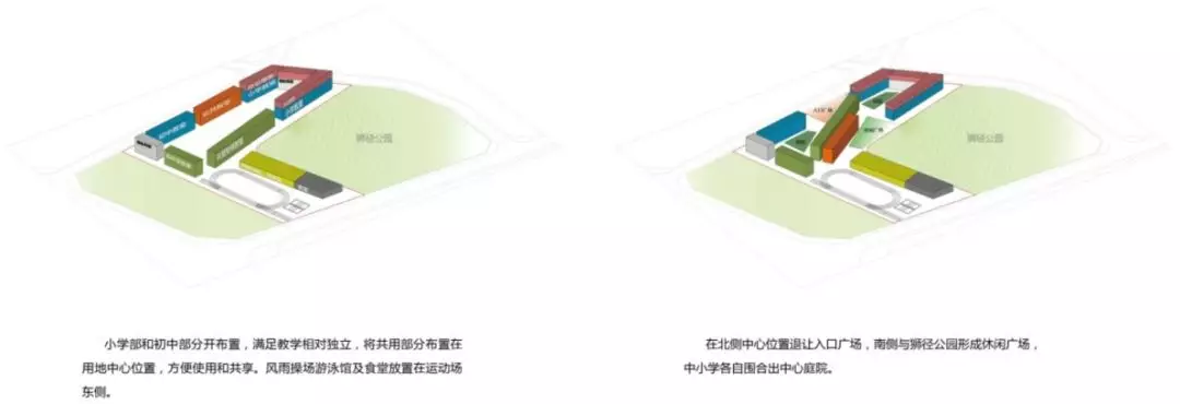 規(guī)劃采用了S型的布局關(guān)系,初中部和小學(xué)部各置一側(cè),各自有相對(duì)獨(dú)立的院落空間的同時(shí),能夠照顧到空間的流通性,使得二者能夠方便地共享公共教學(xué)設(shè)施。