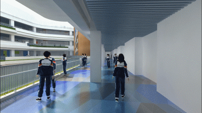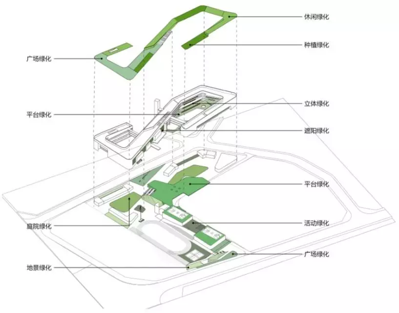 龍華區(qū)行知學(xué)校用地被西側(cè)的城市綠地、東南角的獅徑公園所包裹,具備天然的景觀優(yōu)勢(shì)。在內(nèi)部布局中,將場(chǎng)地、屋頂、架空層、立面結(jié)合起來(lái),賦予多層次的綠化空間,打造真正的綠色校園。