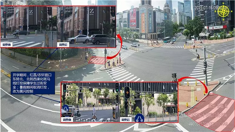 福田紅荔/農(nóng)軒路口暑假期間行人過街流量減少,取消東轉(zhuǎn)北、北轉(zhuǎn)西兩處渠化燈控,改為黃閃控制。