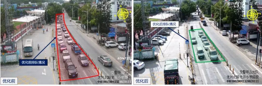 坪山龍興北/龍?zhí)镄W(xué)路口取消行人專用相位后,晚高峰南方向車輛排隊(duì)長度由160米下降至30米,降幅81%,路口車輛排隊(duì)問題明顯緩解。