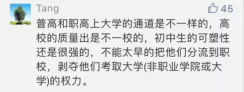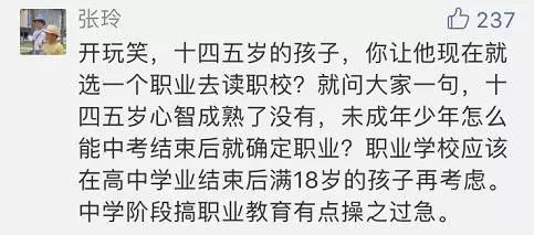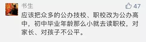 有網(wǎng)友表示:十四五歲的孩子行知尚未成熟,未成年少年無法在中考結(jié)束后就確定職業(yè),職業(yè)學(xué)校應(yīng)該在高中學(xué)業(yè)結(jié)束后滿18歲的孩子再考慮。中學(xué)階段搞職業(yè)教育有點(diǎn)操之過急。