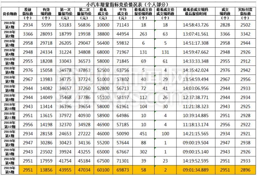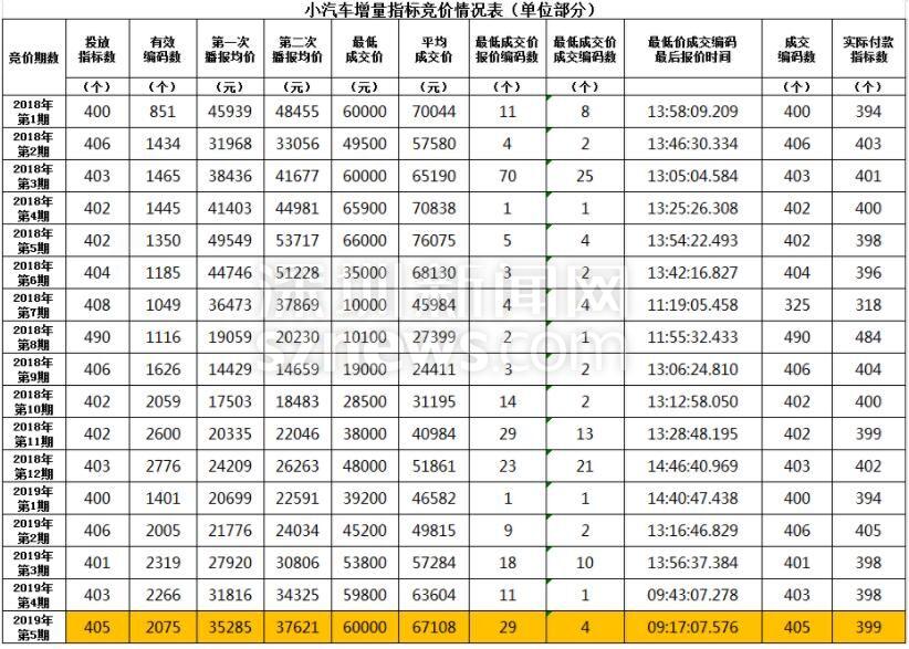 小汽車(chē)增量指標(biāo)競(jìng)價(jià)情況表單位部分(2018年第一期——2019年第五期)