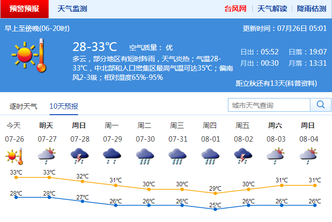 記者從市氣象臺獲悉,受副熱帶高壓影響,26日多云,局部有短時陣雨,氣溫28~33 ℃,局部最高35 ℃;27日多云,部分地區(qū)有短時陣雨或雷雨,天氣炎熱;28日有雷陣雨,伴有短時強降水和6~8級短時大風;29日有雷陣雨,局部大雨;30~31日有一次明顯降雨過程。