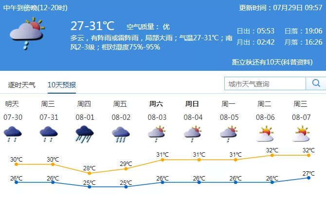 周一至周三有雷陣雨,局部暴雨;周四至周五有一次暴雨降水過(guò)程;周末期間(8月3-4日)有陣雨或雷陣雨。