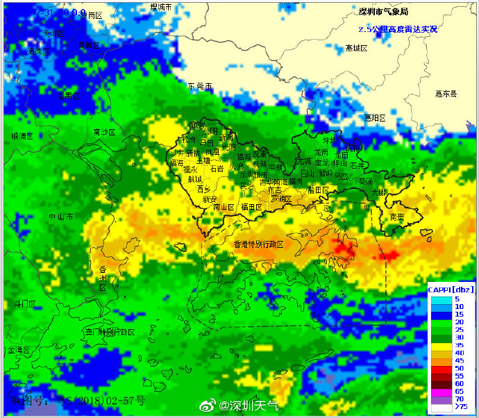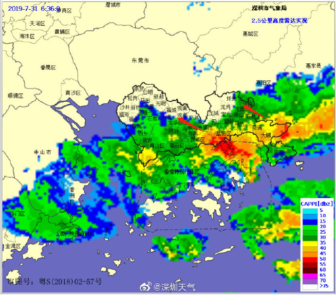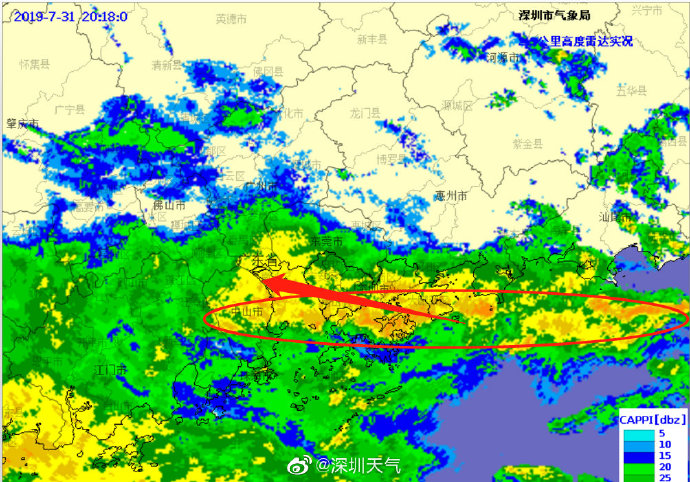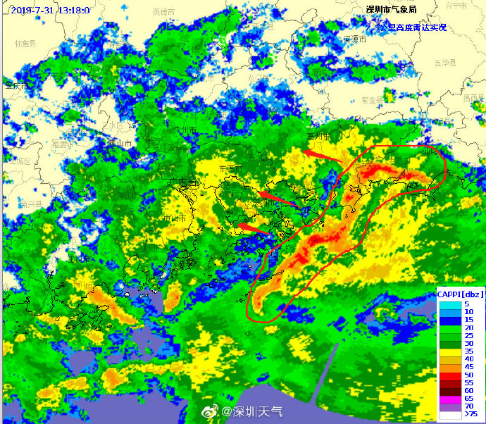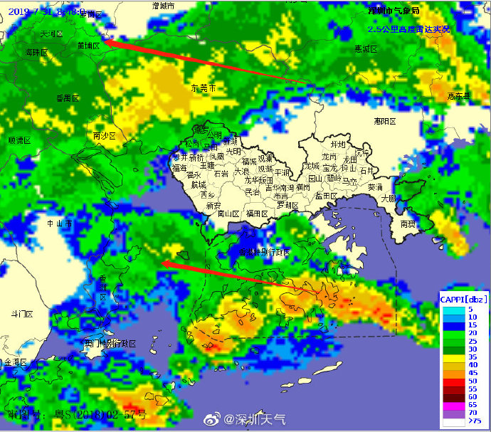 當一條雨帶的長軸和雨帶的移動方向(箭頭)夾角很小時,某個地方就會被這條雨帶幾乎從頭到尾地經(jīng)過,于是這個地方的累計雨量就會特別大。而現(xiàn)在深圳靠南的大部分區(qū)域就在經(jīng)歷一場列車效應,所以這場雨持續(xù)時間比較長,短時間內(nèi)停不下來。