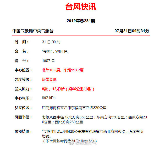 截至7月31日22時,臺風“韋帕”(熱帶風暴級)中心位于廣東省徐聞市東偏南方向約220公里的南海西北部海面上,中心附近最大風力9級,達到每秒23米的風速,六級大風半徑范圍約480公里。