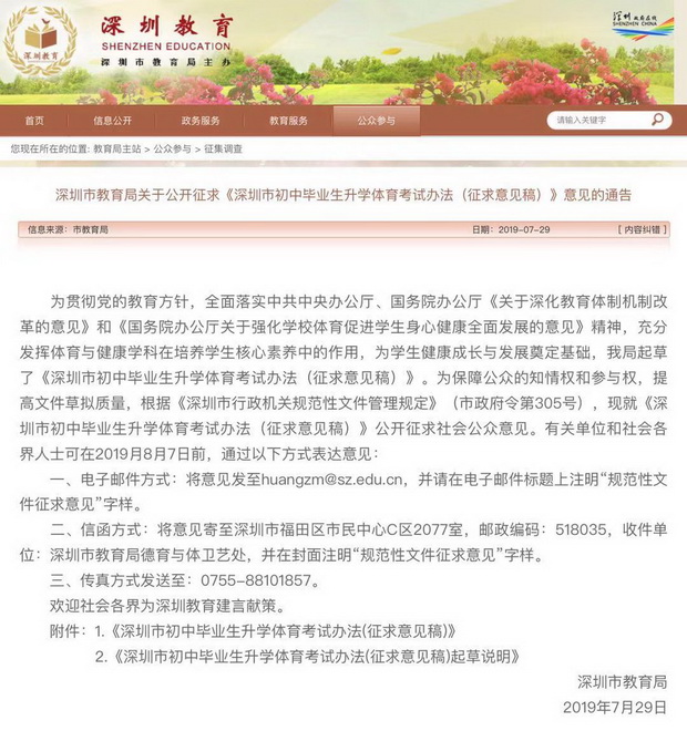 見圳客戶端·深圳新聞網(wǎng)2019年7月31日訊(見圳客戶端·深圳新聞網(wǎng)記者 余俐潔)日前,市教育局發(fā)布《深圳市初中畢業(yè)生升學(xué)體育考試辦法(征求意見稿)》(以下簡稱《考試辦法》)。根據(jù)《考試辦法》中考體育必考科目調(diào)整為中長跑(男生1000米,女生800米)或100米游泳(不限泳姿)二選一,考試總分由現(xiàn)行的30分調(diào)整為50分,從2019年入學(xué)的初一學(xué)生開始實(shí)施,即到2022年及以后的中考考生適用新方案。征求意見時間至2019年8月7日。