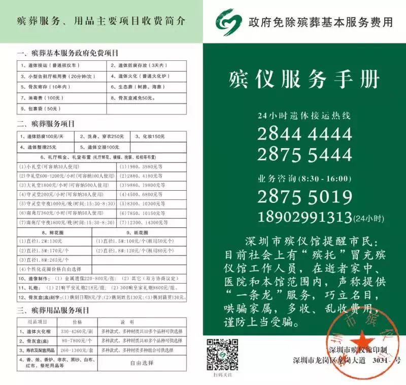 “深圳只有一家合法的殯儀館,就是深圳市殯儀館,其殯儀收費標準可以通過‘深圳民政在線’的‘殯儀服務’查詢。”市殯管所相關負責人表示,市民也可以關注“深圳市殯儀館”的微信公眾號查詢治喪流程、聯系電話和收費標準。