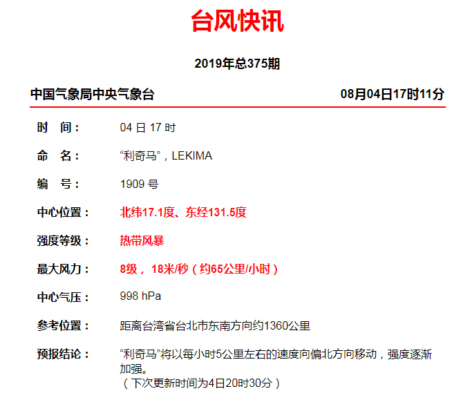 今年第9號臺風"利奇馬"(熱帶風暴級)(英文名稱:LEKIMA;名字來源:越南;名字意義:一種水果)已于4日下午在西北太平洋洋面生成,17時其中心位于我國臺灣省臺北市東南方約1360公里的西北太平洋洋面上,中心附近最大風力8級(18米 /秒),中心最低氣壓998百帕,七級風圈半徑250-420公里。