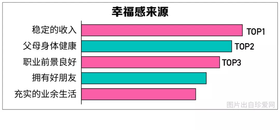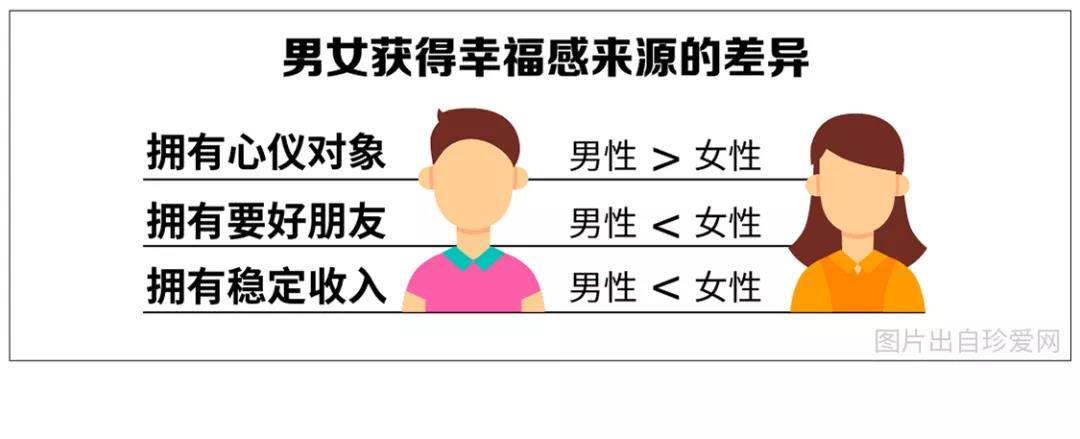 深入研究發(fā)現(xiàn),男性對“擁有心儀對象”的需求比例(6.67%)略高于女性(3.17%),女性則是在擁有要好朋友的比例(28.79%)上高于男性(6.67%),且因為穩(wěn)定收入感到幸福的女性比例(60%)比男性(53%)更高??梢姡愿菀讖姆€(wěn)定的收入中獲得幸福感。
