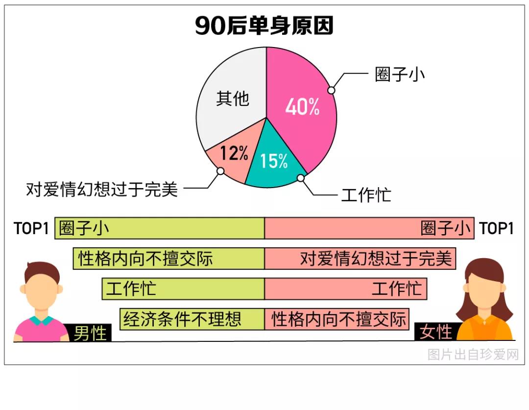調查結果發(fā)現(xiàn),圈子?。?0%)、工作忙(15%)、對愛情幻想過于完美(12%)為90后單身的主要原因。就性別差異而言,除了圈子小之外,男性單身的主要原因是性格內向不擅交際(33.53%)、工作忙(32.07%)以及經(jīng)濟條件不理想(19.02%)。女性單身的主要原因則是對愛情幻想過于完美(29.67%)、工作忙(28.04%)及性格內向不擅交際(14.82%)。從學歷背景看,學歷越高越容易受困于生活圈子小和工作忙帶來的擇偶問題,而且博士人群對愛情幻想過于完美的比例比其他學歷的人群更高。
