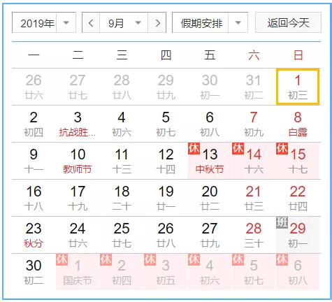 2019下半年節(jié)假日都在這了