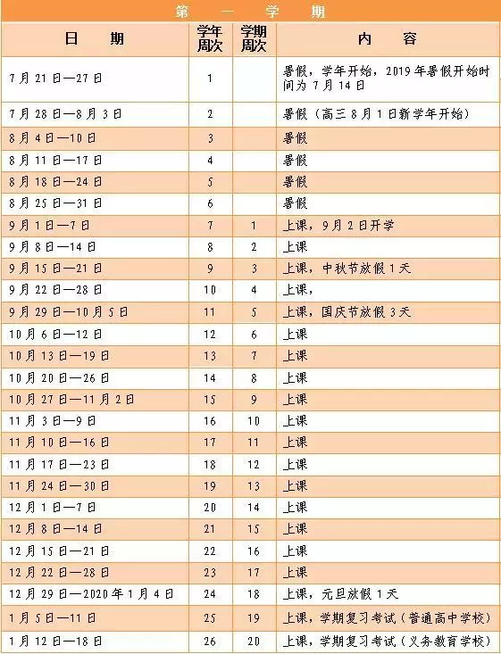 第一學(xué)期年20周,2019年9月1日至9月7日為第一學(xué)期第1周,9月2日開學(xué),寒假從2020年1月19日開始;第二學(xué)期22周,2020年2月9日至2月15日為第二學(xué)期第1周,2月10日開學(xué),暑假從2020年7月12日開始。