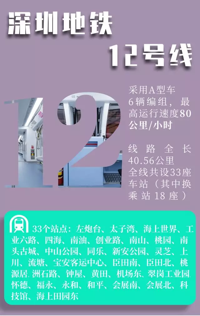 地鐵12號(hào)線起自南山區(qū)左炮臺(tái)站自南向北穿越南山中心區(qū)、寶安中心區(qū)、福永、大空港等片區(qū)后終至寶安區(qū)海上田園東站,線路全長(zhǎng)40.56km,是進(jìn)一步支撐深圳西部發(fā)展,提升前海蛇口自貿(mào)區(qū),空港新城發(fā)展品質(zhì)的交通骨干線。