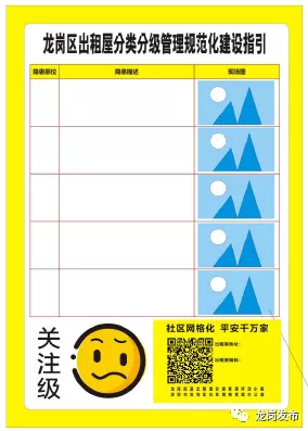 出租屋將分為寬管級(jí)(綠標(biāo))、關(guān)注級(jí)(黃標(biāo))、嚴(yán)管級(jí)(橙標(biāo))、禁止級(jí)(紅標(biāo))四個(gè)級(jí)別。結(jié)合房屋二維碼對四個(gè)級(jí)別實(shí)行動(dòng)態(tài)標(biāo)色管理,以房屋二維碼的底色來標(biāo)注。