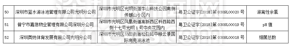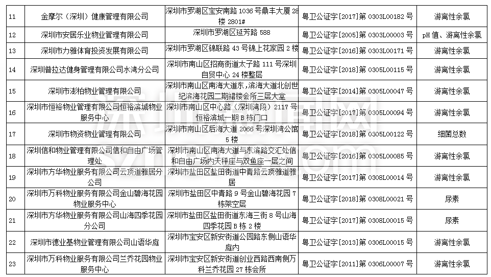 此次檢查結(jié)果顯示,深圳明門偉健體育服務(wù)有限公司(游泳池)、深圳市綠景物業(yè)管理有限公司城市立方花園管理處(游泳池)、深圳市盛世家物業(yè)管理有限公司花半里物業(yè)管理處(游泳池)尿素、游離性余氯兩項檢測指標(biāo)不合格,深圳市力美健華聯(lián)健身有限公司(游泳池)pH值、尿素兩項檢測指標(biāo)不合格,錦龍體育文化發(fā)展(深圳)有限公司(游泳池)、深圳市安居樂業(yè)物業(yè)管理有限公司(游泳池)、深圳市天健物業(yè)管理有限公司陽光天健城管理處(游泳池)pH值、游離性余氯兩項檢測指標(biāo)不合格,此外,有45家游泳場所分別因pH值、尿素、游離性余氯、細(xì)菌總數(shù)以及大腸菌群等指標(biāo)不合格被予以通告。衛(wèi)生監(jiān)督部門已責(zé)令抽檢結(jié)果不合格單位立即整改。