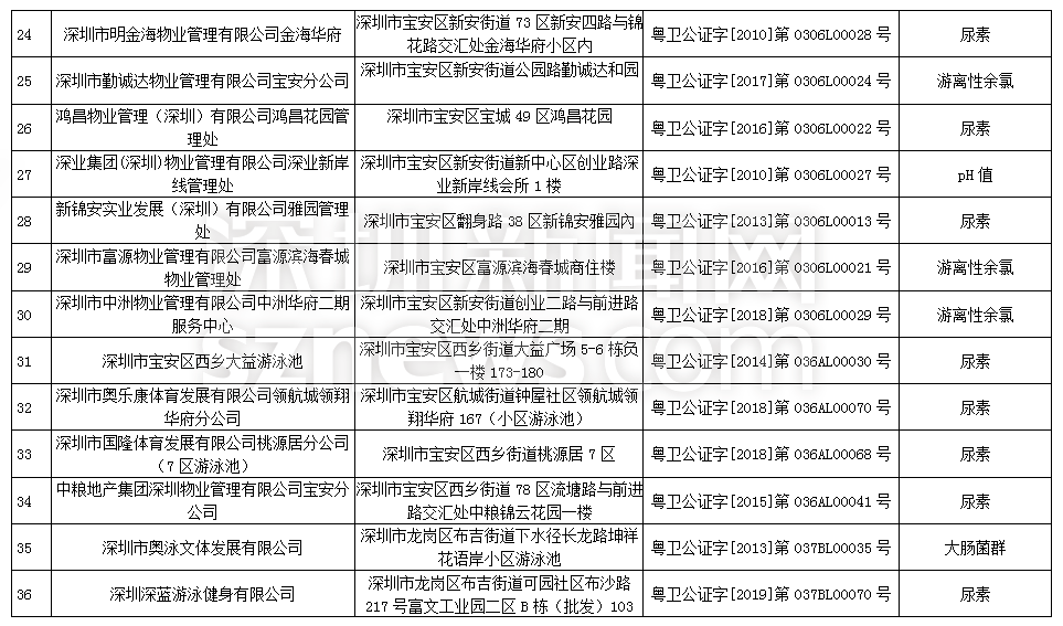 見圳客戶端·深圳新聞網(wǎng)2019年8月29日訊(見圳客戶端、深圳新聞網(wǎng)記者 劉夢婷 通訊員 深衛(wèi)監(jiān))深圳市衛(wèi)生健康委近期組織了各級衛(wèi)生監(jiān)督機構(gòu)對全市游泳場所水質(zhì)進(jìn)行了分批專項抽樣檢驗,并在近日公布了2019年第二批游泳場所水質(zhì)抽檢結(jié)果。第二批共抽檢游泳場所451家,檢測指標(biāo)為游離性余氯、渾濁度、尿素、pH值、細(xì)菌總數(shù)、大腸菌群等六項。抽檢的451家游泳場所中,合格399家,合格率為88.47%,不合格52家,不合格率為11.53%;不合格指標(biāo)主要為游離性余氯、尿素、細(xì)菌總數(shù)、pH值和大腸菌群。