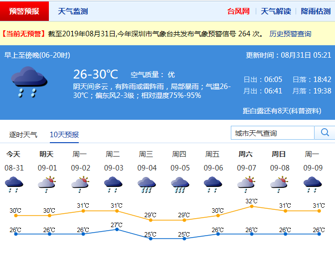 見圳客戶端·深圳新聞網(wǎng)2019年8月31日訊 昨日,深圳市氣象局舉行9月天氣趨勢(shì)新聞發(fā)布會(huì)。記者獲悉,8月底至10月,進(jìn)入后汛期的深圳還將有1至2個(gè)臺(tái)風(fēng)進(jìn)入500公里范圍,帶來(lái)明顯降水,高溫天氣將在9月份所緩解。