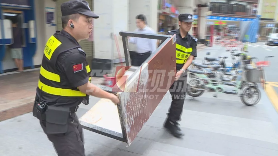 記者以普通市民的身份,投訴了這家門店的違規(guī)經(jīng)營情況。10分鐘后,東門街道執(zhí)法隊就來到了現(xiàn)場,向商家開具了整改通知,拆除了占道的鍋臺,并暫扣了一批經(jīng)營用具。