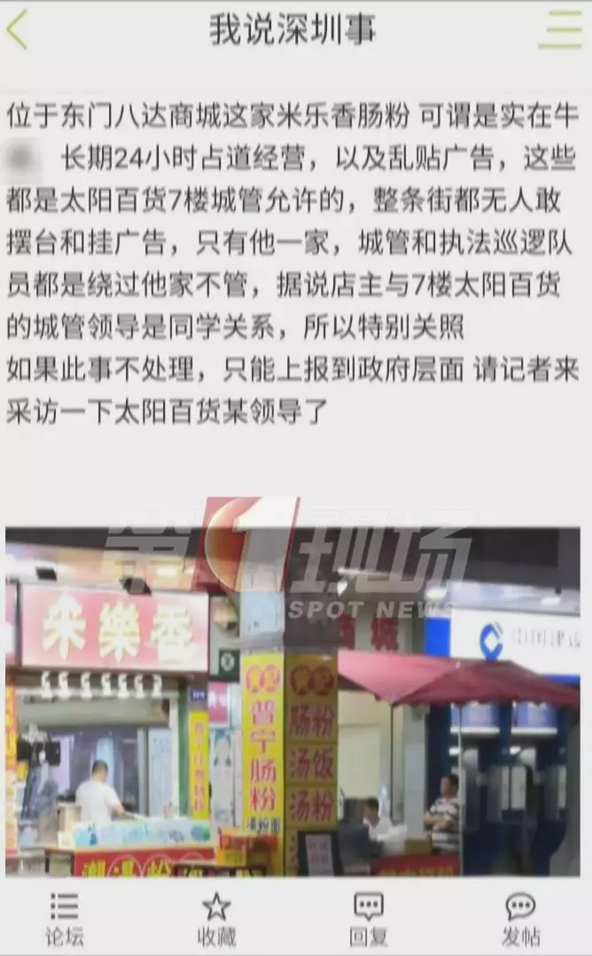 昨天,論壇上的一則帖子引起網(wǎng)友圍觀,帖子提到位于東門八達(dá)商城的米樂腸粉店,24小時占道經(jīng)營,亂貼廣告。整條街都不敢這么做,唯獨(dú)這家沒有城管管理,原因是店主跟7樓太陽百貨的城管領(lǐng)導(dǎo)是同學(xué)。