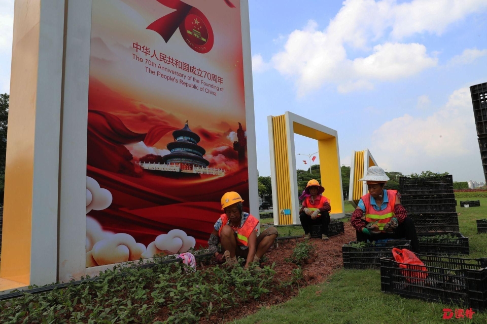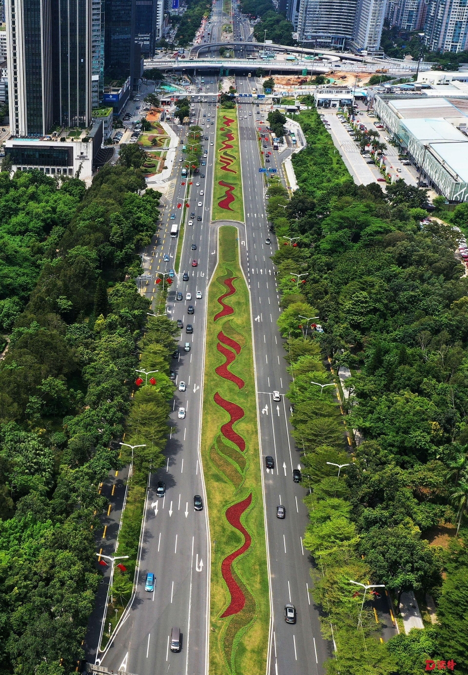 車輛行駛在深南大道上,沿路多處可以看到綠化工人們正在綠化帶上忙碌著,種植鮮花,修剪草坪,澆水養(yǎng)護(hù)。深南大道東段中間帶上,大紅色的赤壁,搭配藍(lán)色、粉色的大花香彩雀以及白里透粉的夏堇,共同組成了流線型的“鳳凰飛羽”圖案造型。從高處看去,綠化帶與兩側(cè)路燈上懸掛的鮮艷的國旗交相輝映,濃濃的節(jié)日氣息撲面而來。
