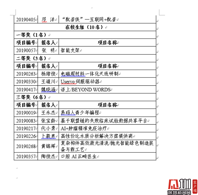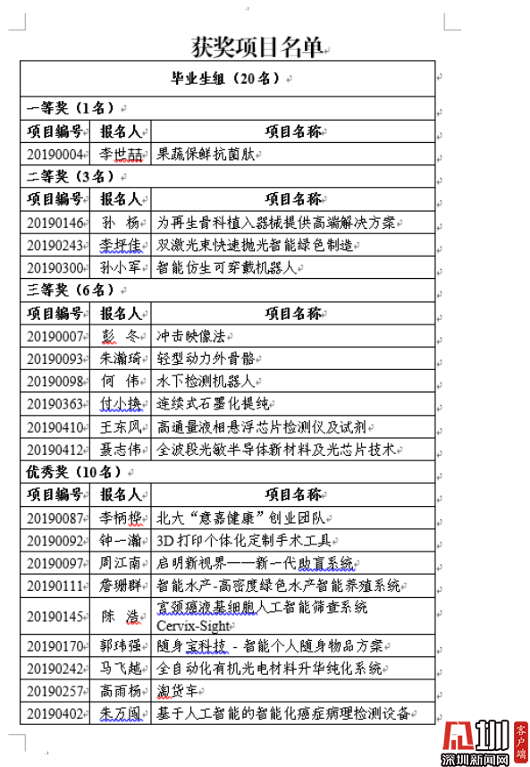 據(jù)了解,2019深圳“逐夢杯”大學(xué)生創(chuàng)新創(chuàng)業(yè)大賽由市人力資源保障局、市教育局、團(tuán)市委共同主辦,深圳大學(xué)等15所高校協(xié)辦,市公共就業(yè)服務(wù)中心承辦。大賽自2016年開始,每年舉辦一屆,今年是第四屆。本屆大賽延續(xù)“逐夢青春創(chuàng)贏未來”的主題,也是首次將港澳籍青年創(chuàng)業(yè)者納入?yún)①惙秶?。大賽于今?月正式啟動,共有397個項目報名參賽,參賽項目歷經(jīng)資格初審、初賽、復(fù)賽、決賽,最終30個優(yōu)秀創(chuàng)業(yè)項目脫穎而出,贏得大獎。其中,“果蔬保鮮抗菌肽”項目獲畢業(yè)組一等獎,“智能仿生可穿戴機(jī)器人”等3個項目獲畢業(yè)組二等獎,“沖擊映像法”等6個項目獲畢業(yè)組三等獎,“北大‘意嘉健康’創(chuàng)業(yè)團(tuán)隊”等10個項目獲畢業(yè)組優(yōu)秀獎;“智能支架”項目獲在校生組一等獎,“Uservo伺服驅(qū)動器”等3個項目獲在校生組二等獎,“易碼人青少年編程”等6個項目獲在校生組三等獎。
