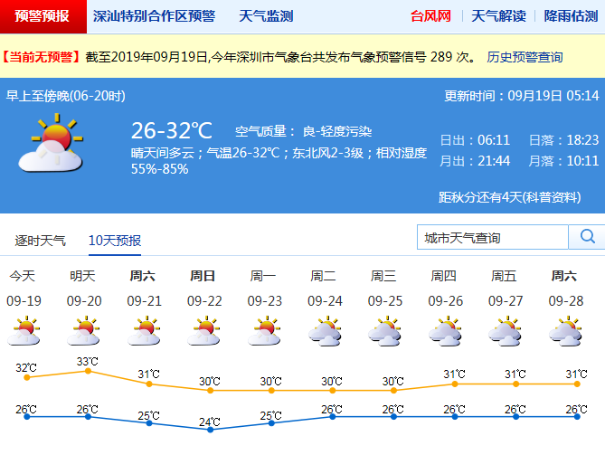 見圳客戶端·深圳新聞網(wǎng)2019年9月19日訊 記者從深圳市氣象局獲悉19日晴天間多云,氣溫26-33℃;20-23日持續(xù)晴熱干燥。其中菲律賓以東洋面的熱帶擾動(dòng)云團(tuán)正在發(fā)展,預(yù)計(jì)其總體趨勢北上,對我市以及華南沿海無明顯風(fēng)雨影響,但20日前后將受其外圍偏北下沉氣流影響。