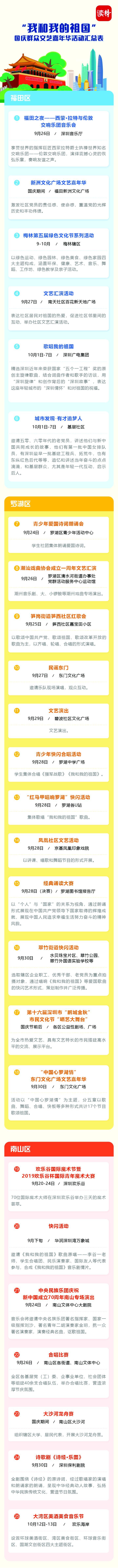 為慶祝中華人民共和國(guó)成立70周年,深圳市將舉辦專場(chǎng)音樂會(huì)、群眾文藝晚會(huì)、焰火晚會(huì)等活動(dòng),同時(shí)將舉行10場(chǎng)“愛我中華——南粵百園慶國(guó)慶”主題游園及80場(chǎng)“我和我的祖國(guó)”國(guó)慶群眾文藝嘉年華活動(dòng)。主題游園和文藝嘉年華活動(dòng)安排如下: