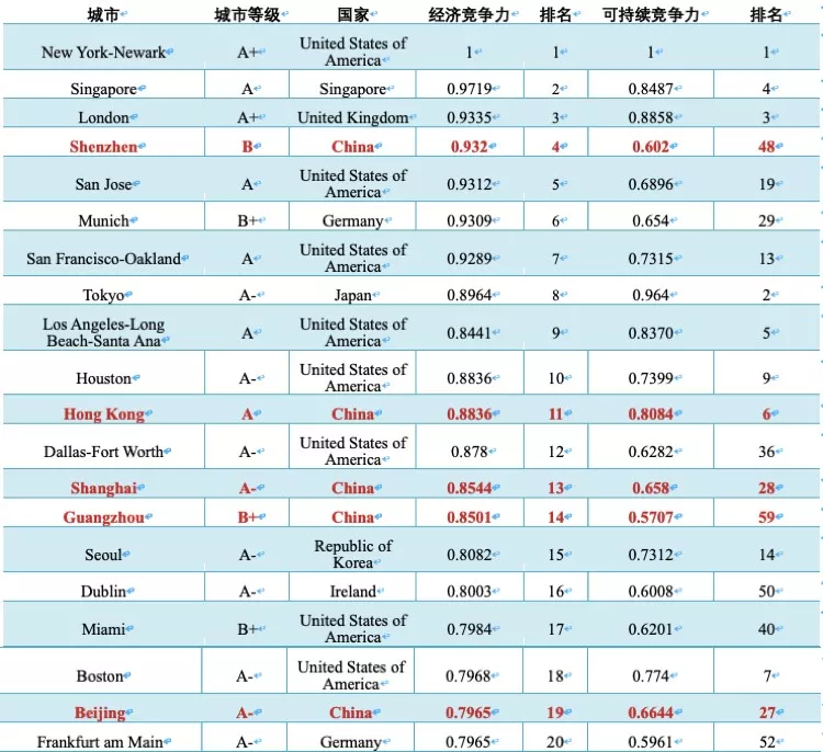 《報告》最重要的工作之一,就是通過對全球1007個城市的“經濟競爭力”進行測度。而測度結果顯示,2018年全球城市經濟競爭力指數(shù)二十強:紐約、新加坡、倫敦、深圳、圣何塞、慕尼黑、舊金山、東京、洛杉磯、休斯頓、香港、達拉斯、上海、廣州、首爾、都柏林、邁阿密、波士頓、北京和法蘭克福。
