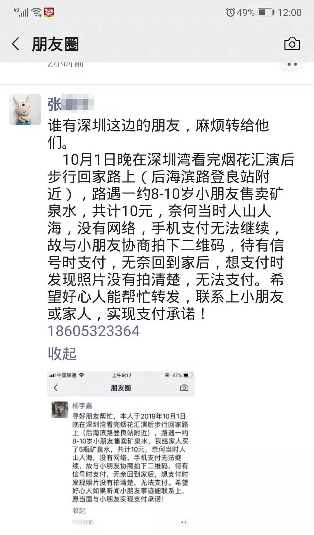 “10月1日晚,在深圳灣看完煙花表演后步行回家路上,路遇一約8-10歲小朋友售賣礦泉水,共計10元,奈何當(dāng)時人山人海,沒有網(wǎng)絡(luò)信號,手機(jī)無法支付,故與小朋友協(xié)商拍下二維碼,待有信號時支付,無奈回到家后,想支付時發(fā)現(xiàn)照片沒有拍清楚,無法支付。希望好心人能幫忙轉(zhuǎn)發(fā),聯(lián)系上小朋友或家人,實現(xiàn)支付承諾!”