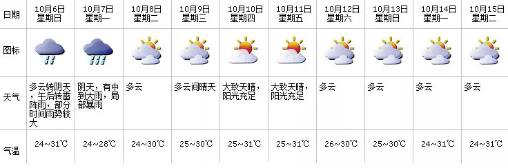 今明兩日有中到大雨,局部暴雨,降雨集中在6日午后至7日上午,部分時(shí)間伴有雷暴,沿海和高地陣風(fēng)6-8級,6日氣溫24-31℃;8-11日多云到晴天;12日有小雨。假期返程高峰期有明顯降雨和大風(fēng),請加強(qiáng)海上活動(dòng)和道路交通安全的管理。