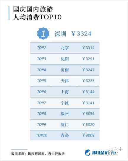 哪些城市居民的平均消費(fèi)最高?根據(jù)攜程跟團(tuán)游和自由行數(shù)據(jù),“國(guó)內(nèi)游消費(fèi)力前十強(qiáng)城市”依次為深圳、北京、沈陽(yáng)、濟(jì)南、天津、上海、寧波、福州、廈門(mén)和青島。這些城市國(guó)慶旅游單次國(guó)內(nèi)游人均花費(fèi)超過(guò)3000元,其中深圳人最舍得花錢(qián),單次國(guó)內(nèi)旅游人均花費(fèi)達(dá)到了3324元。