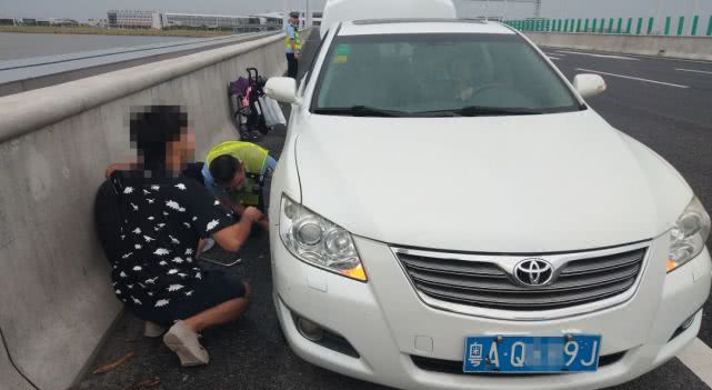 10月5日下午4點(diǎn)多,珠海交警郭警官開著警車在珠三角環(huán)線高速巡邏時(shí),看到有一輛粵AQ××9J號白色豐田小車??吭趹?yīng)急車道上,打著雙閃。郭警官立即上前詢問情況,原來小車剛上高速沒多久就爆胎了,司機(jī)深知在高速停下來很危險(xiǎn),急得團(tuán)團(tuán)轉(zhuǎn),天還下起了小雨。