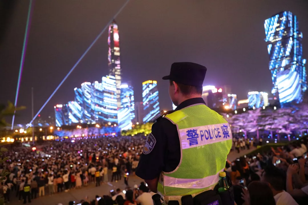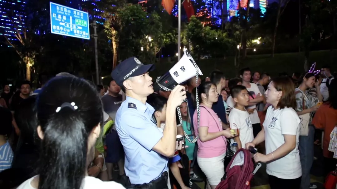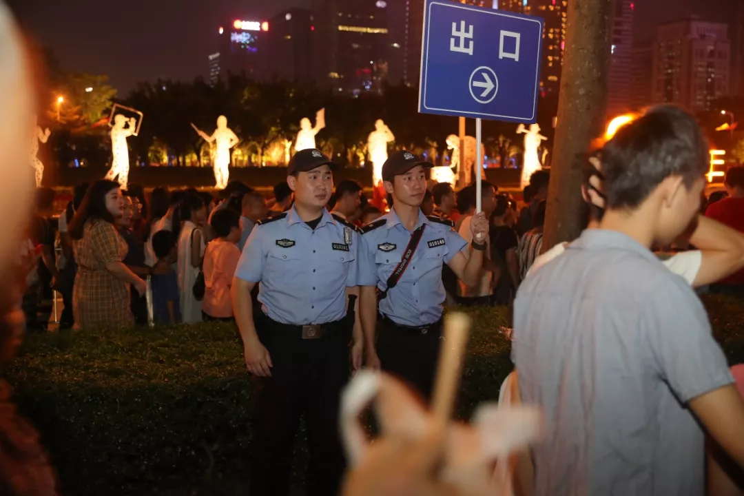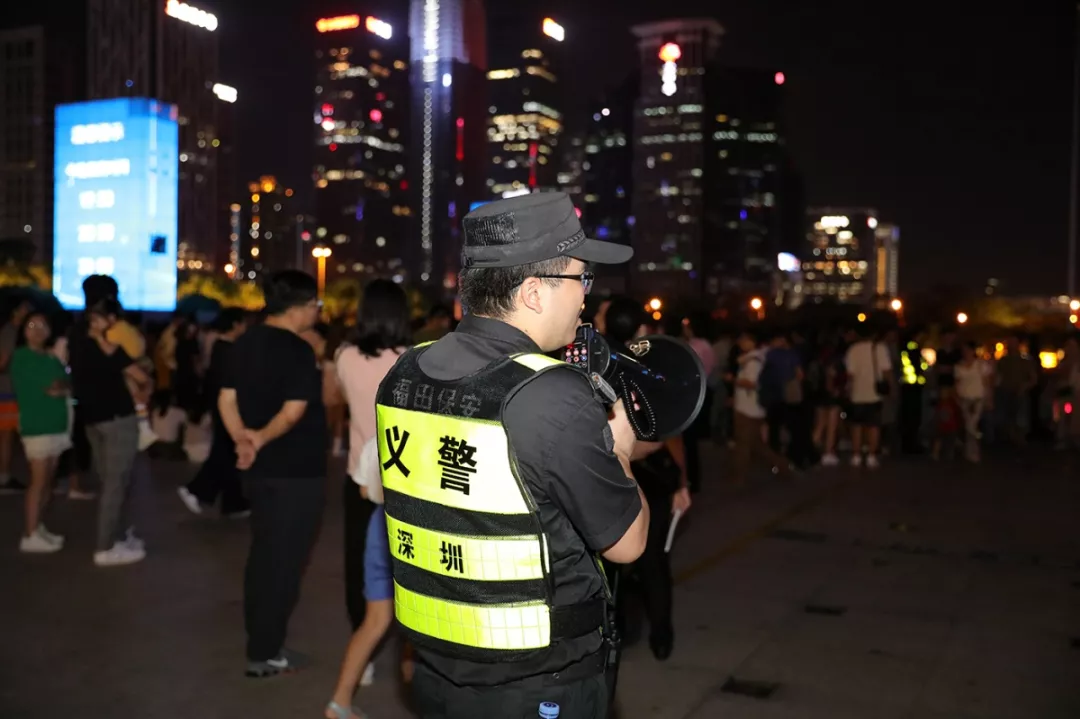 此外,福田公安分局根據(jù)市民中心和蓮花山頂廣場的每日人流負荷情況實時調(diào)整,及時協(xié)調(diào)城管調(diào)控?zé)艄庑悴コ鰰r間并加演,避免人流停滯,緩解疏導(dǎo)壓力。值得一提的是,為了方便市民夜間行走,觀賞區(qū)特地“開辟”了幾條新的應(yīng)急道路,并在所有“黑暗死角”都加裝了應(yīng)急燈。福田公安分局指揮處處長張保軍表示:“在安保警力多次實地巡查后,及時發(fā)現(xiàn)問題并整改、疏通光線不足及堵塞人群的道路,使市民們在觀看完燈光秀后能夠更加安全、快捷地離開?!背艘酝猓谌肆髅芗臒艄庑悻F(xiàn)場,孩童走失、物品遺失的情況也有發(fā)生,安保人員不斷地通過廣播尋人、尋物,進行實名登記,盡心盡力地為市民、游客解決切身難題。