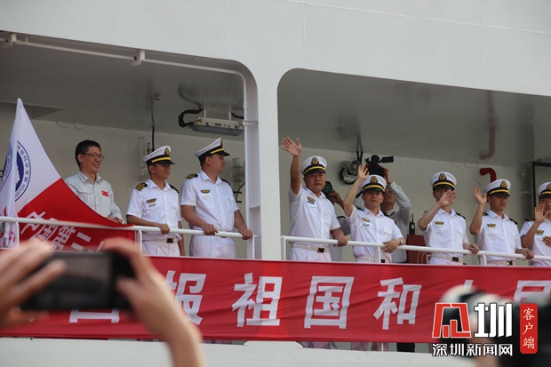 雪龍2號(hào)上的船員和科考隊(duì)員向岸上的送別人群揮手告別,“感謝祖國(guó)、感謝深圳!”