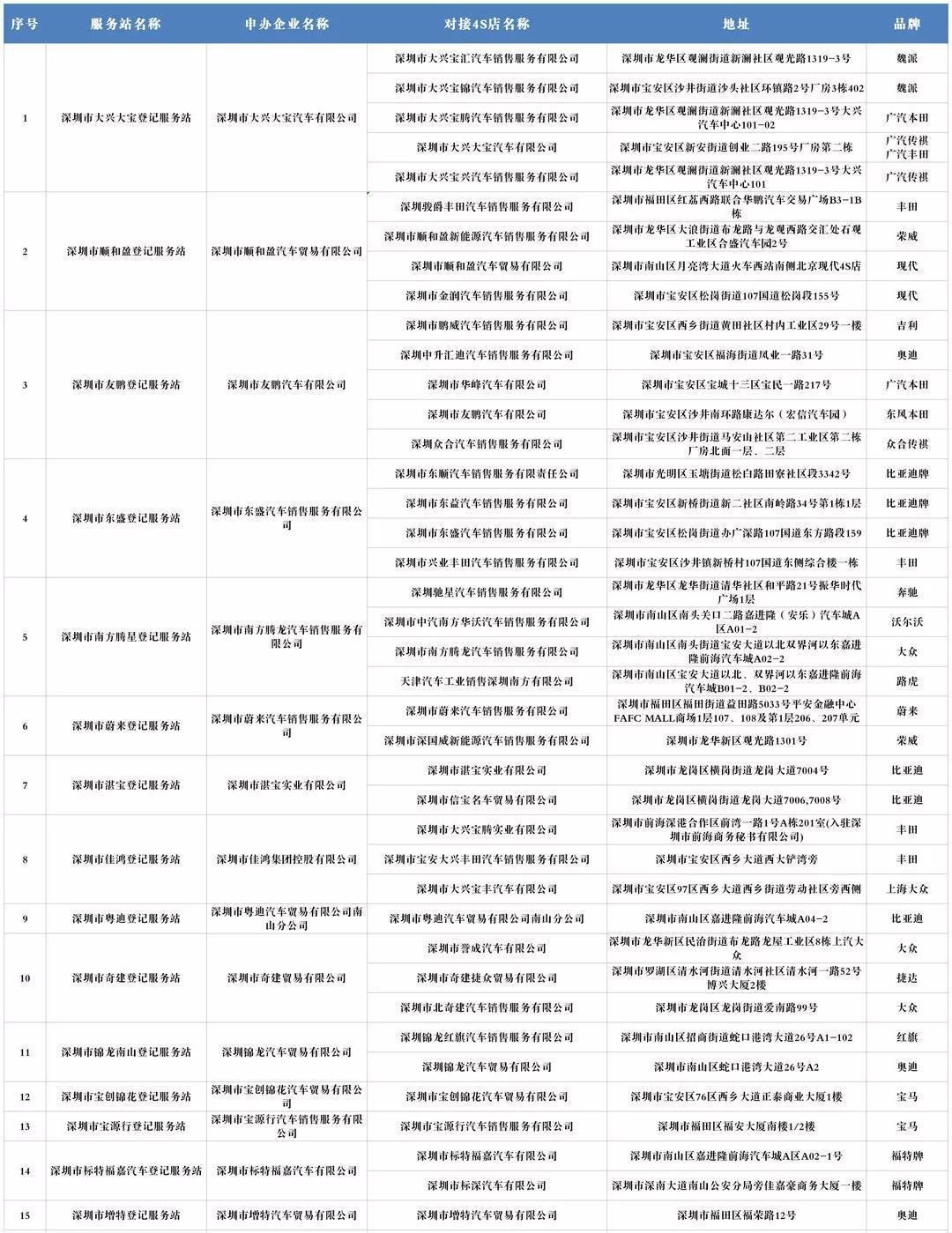 據悉,2019年9月2日,深圳市交管部門選定15家新車登記服務站、5家二手車登記服務站為第一批快捷代辦登記試點,各試點可以備案多家沒有服務站的4S店(需將資料交至車管所備案)。