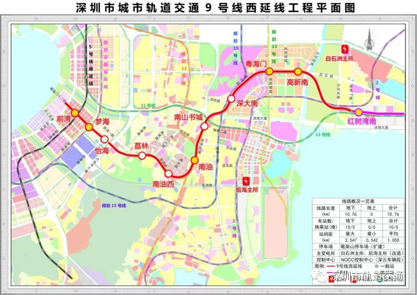 地鐵9號線西延線深入南山中心區(qū)和前海自貿(mào)區(qū),西起前灣站(與5號線南延線換乘),東至紅樹灣南站,全長約10.8公里,共設(shè)10座車站,其中5座換乘站。