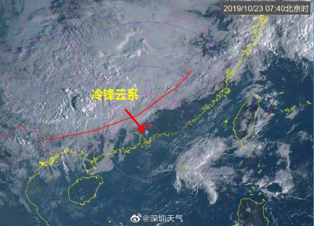目前冷空氣前鋒已到達(dá)粵北,預(yù)計今日傍晚前后到貨,深圳屆時深圳云量增多,可能伴隨著分散小雨。