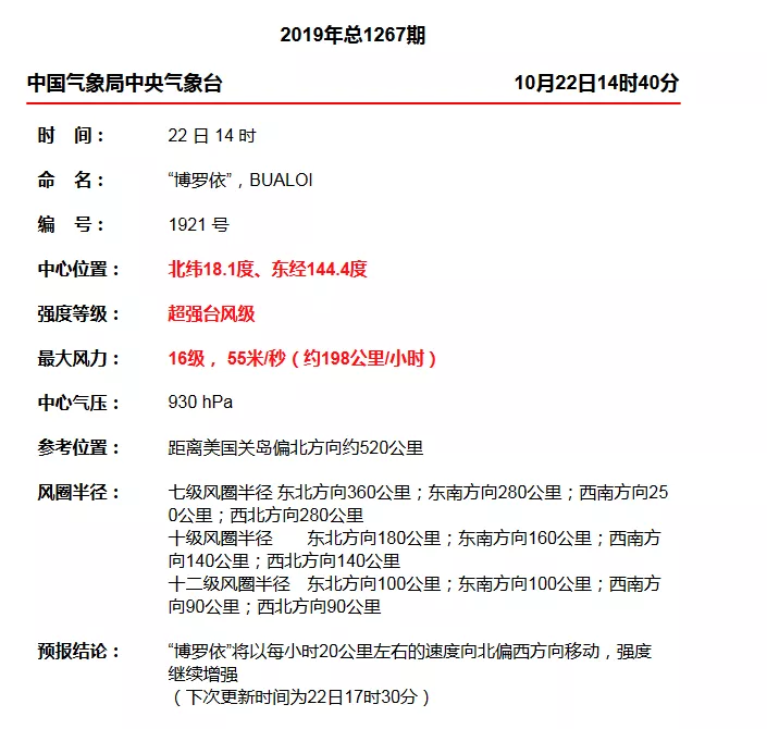 今年第21號臺風(fēng)“博羅依”已于10月22日凌晨加強為強臺風(fēng)級,早晨5點鐘其中心位于美國關(guān)島北偏東方向約370公里的西北太平洋洋面上,就是北緯16.7度、東經(jīng)145.5度,中心附近最大風(fēng)力有14級(42米/秒),中心最低氣壓為955百帕,七級風(fēng)圈半徑180-280公里,十級風(fēng)圈半徑100-160公里,十二級風(fēng)圈半徑50-80公里。