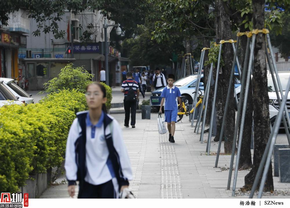 兩位分別穿夏裝和冬裝的學生。2019年10月24日,上學高峰期,福田新洲。