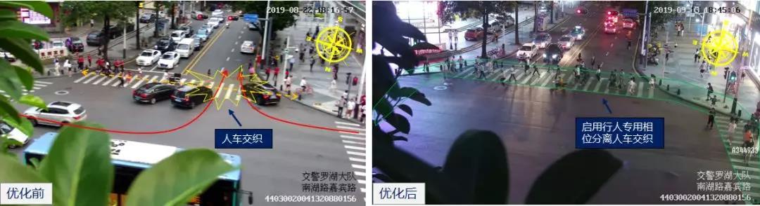 針對現(xiàn)狀問題,深圳交警采用單周雙次的信控策略,小批量、多頻次地放行嘉賓路方向車輛,緩解因公交車隊列化導(dǎo)致路口交通鎖死的問題;同時,采用行人專用相位集中放行行人,保障行人過街安全。路口優(yōu)化后,路口“回堵”現(xiàn)象顯著減少,行人過街安全性提高,路口高峰小時通過量從2130pcu/h增至2285pcu/h,上升7.28%。
