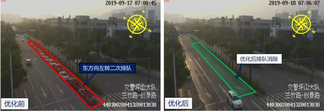 為解決該時(shí)段擁堵情況,交警優(yōu)化調(diào)整該路口早高峰時(shí)段紅綠燈,將早高峰時(shí)段由7時(shí)30分提前至6時(shí)50分,同時(shí)增加?xùn)|方向左轉(zhuǎn)綠燈時(shí)間20秒,以滿足車流通過需求。優(yōu)化后東方向左轉(zhuǎn)二次排隊(duì)情況消除,東方向左轉(zhuǎn)車通行量由原144pcu/h上升至196pcu/h,上升36.1%。