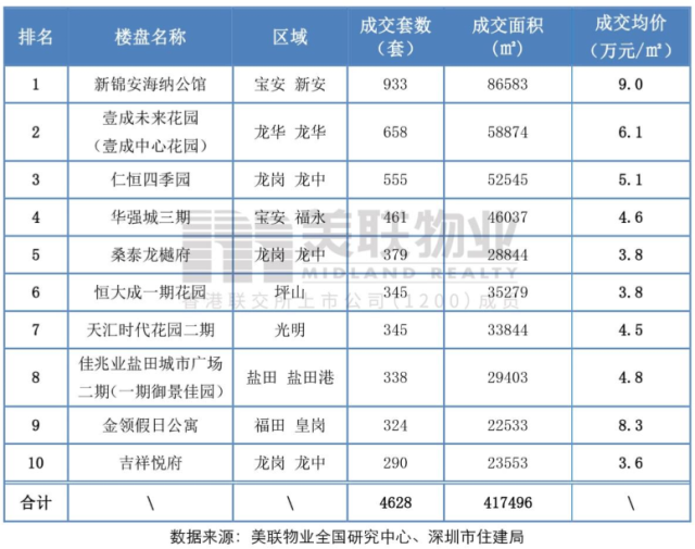 2019年第三季度深圳二手住宅成交TOP10