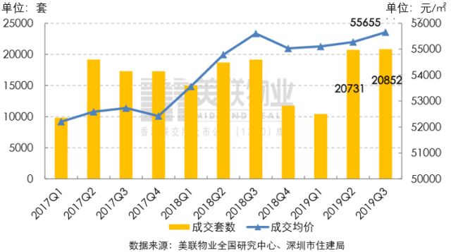 2019年第三季度二手住宅市場(chǎng)延續(xù)第二季度成交熱度,共備案20852套二手住宅,再創(chuàng)三年來(lái)季度成交量新高,較今年第二季度上升0.6%,同比去年第三季度上升8.9%;總成交面積約173.80萬(wàn)㎡。美聯(lián)物業(yè)(深圳)藍(lán)籌住宅價(jià)格方面,今年第三季度全市二手住宅的成交均價(jià)為55655元/㎡,較第二季度上漲0.7%,同比去年第三季度上漲0.1%。
