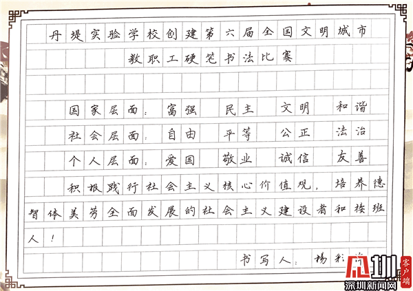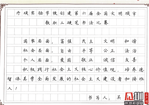 見圳客戶端·深圳新聞網(wǎng)10月29日訊(見圳客戶端、深圳新聞網(wǎng)記者 潘寶儀 通訊員 袁小俊 圖/朱雅琪 ) 為落實(shí)立德樹人總目標(biāo)、培育和踐行社會(huì)主義核心價(jià)值觀,創(chuàng)建文明城市,積極倡導(dǎo)全校教職工勤練教學(xué)基本功,提高教師綜合素養(yǎng),豐富課余生活,展示丹堤實(shí)驗(yàn)學(xué)校教職工風(fēng)采,學(xué)校于10月25日舉行了“創(chuàng)建第六屆全國文明城市教職工硬筆書法比賽”。