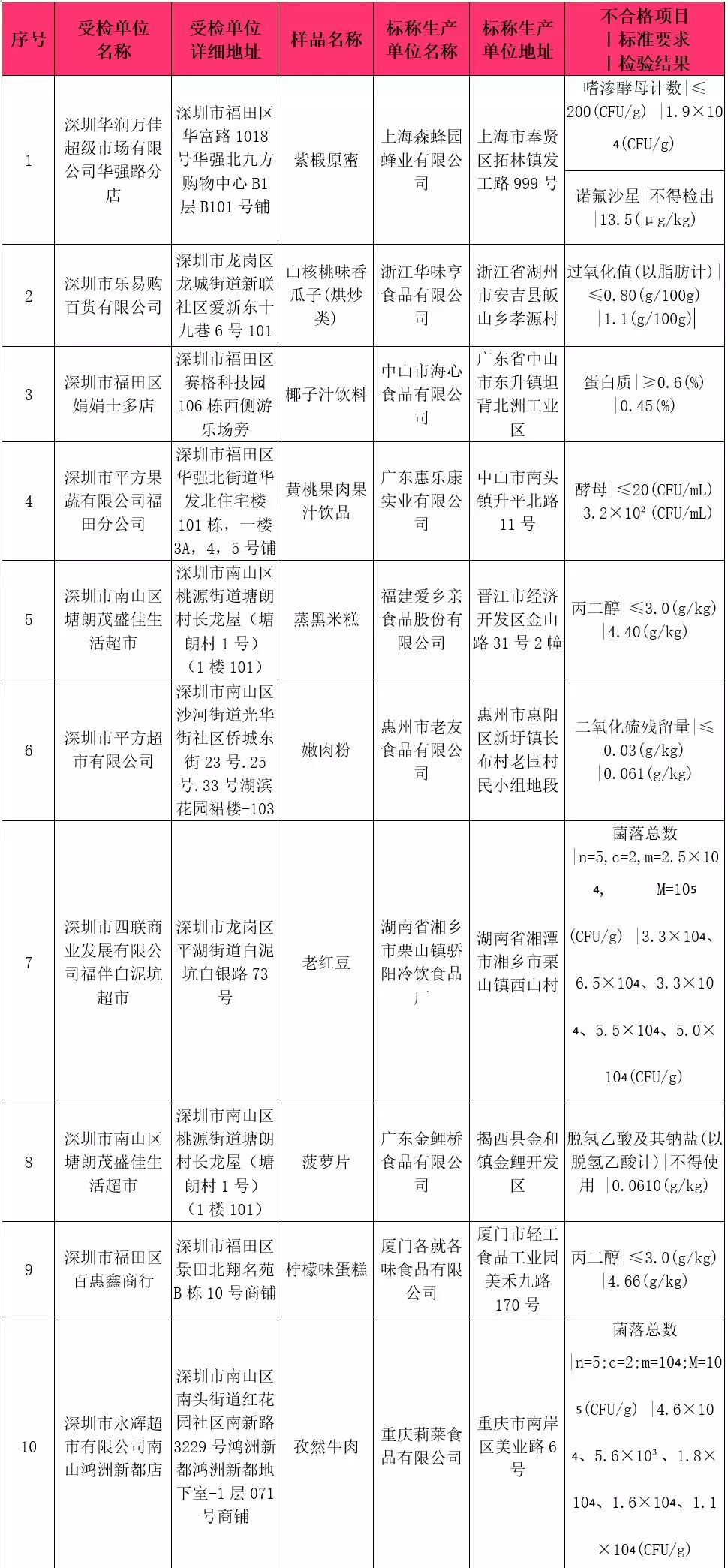本次抽檢不合格食品