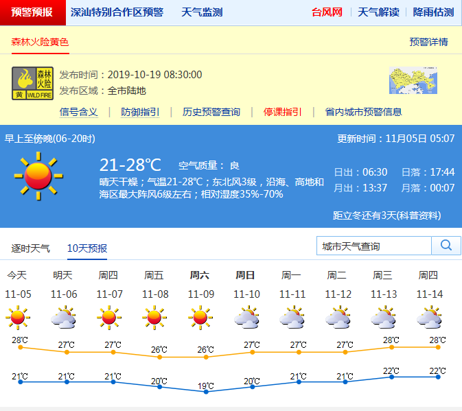 據(jù)悉,11月初的深圳天氣"晴"深意切,11月3日白天最高溫達到30℃。記者從市氣象臺獲悉,本周天氣將有所轉(zhuǎn)變,有兩股弱冷空氣將影響深圳,氣溫將有小幅波動。